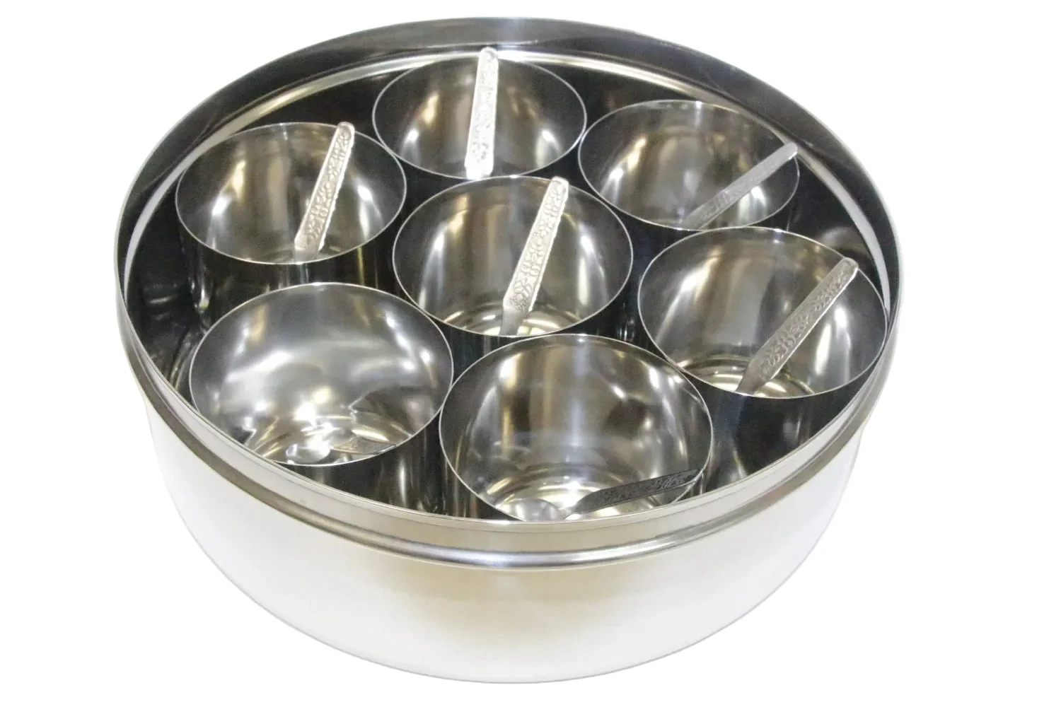 TABAKH Stainless Steel Masala Dabba Spice Container Box with Spoon. Made by the finest stainless steel material which ensures strength, quality and durability. Its design and finishing will make a wonderful experience in regular use.